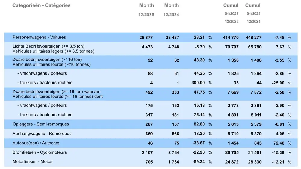 Le mois de décembre 2025 a marqué un net rebond du marché belge des véhicules neufs. Derrière cette performance mensuelle apparaissent toutefois des évolutions contrastées selon les segments. Voici un aperçu chiffré des voitures particulières, des utilitaires et des motos sur l’ensemble de l’année 2025.