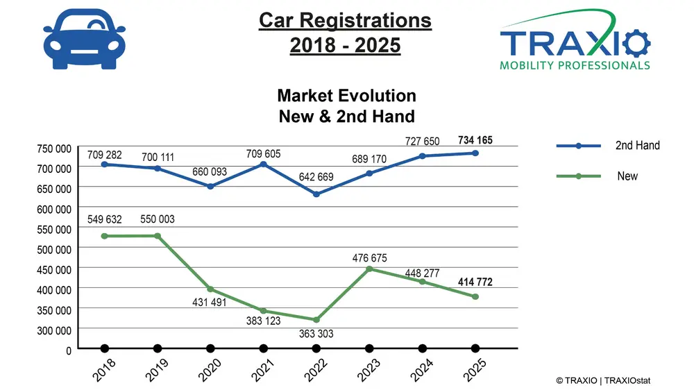 Le marché belge de l’occasion confirme son rôle clé. En 2025, près de deux tiers des immatriculations concernaient des voitures de seconde main. Pression sur les prix, disponibilité immédiate et incertitude technologique soutiennent la tendance.