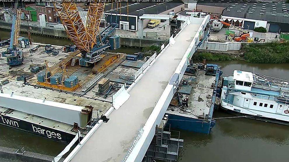 In het weekend van 15 tot 17 september 2017 plaatste aannemer THV BAM Contractors-Aelterman een nieuwe fietsers- en voetgangersbrug in Wetteren. De onderdelen daarvoor werden via het water getransporteerd van bij Aelterman in Gent naar Wetteren. De firma Sarens monteerde eerst de voet van de pyloon op de linkeroever. Vervolgens plaatste de aannemer het stalen gedeelte van de ‘aanbrug’ op tijdelijke montagetorens. De afwerking van de kabelbrug zal in de komende twee maanden gebeuren. Zo moet de tijdelijke brugleuning plaats maken voor de nieuwe en ontbreekt onder meer de verlichting nog. Na het nodige las- en afstelwerk zullen de vier staalkabels worden opgespannen tussen de pyloon en het brugdek. Vanaf dan draagt de pyloon het volledige gewicht van de brug en verdwijnen de tijdelijke montagetorens.