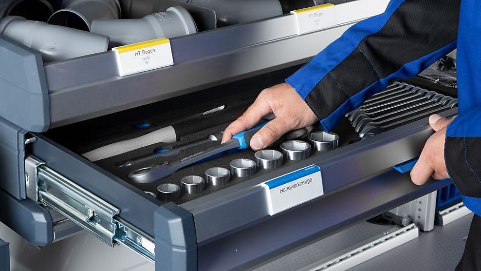 Ongecoördineerde zoekacties in je bedrijfsvoertuig en je (mobiele) atelier laten niet alleen een zeer onprofessionele indruk na bij opdrachtgevers en eindklanten, ze kosten ook heel wat waardevolle tijd. Sortimo, inrichter van bedrijfsvoertuigen, ontwikkelt oplossingen voor een efficiënt georganiseerde werkplek en komt daarmee tegemoet aan reële marktvragen. De nieuwe mySortimo-etiketten en de inlegstukken voor gereedschap, ontwikkeld volgens de gevestigde 5S-methode, zijn daarvan het meest recente voorbeeld. Sortimo integreert de 5S-methode - Sorteren, Schikken, Schoonmaken, Standaardiseren, Systematiseren - in het bedrijfsvoertuig. Het doel is om orde en netheid op de werkplek te optimaliseren voor een maximale productiviteit. De SR5-voertuiginrichting van Sortimo biedt dankzij de speciaal op de werkprocessen afgestemde configuratiemogelijkheden en geïntegreerde systematisering precies die voorwaarden die nodig zijn om dat doel in de dagelijkse praktijk te brengen. Eén van de elementen die bijdragen aan een optimaal georganiseerde werkplek zijn de nieuwe mySortimo labels. De labels zijn scheurvast, vochtbestendig en hebben een optimale hechting. De kleurcodering zorgt bovendien voor optische identificatie en ook de individuele beschrijving levert een snelle toegang op tot de inhoud van legborden, schuifladen, koffers en de Sortimo BOXX’en. Sortimo ontwikkelde in samenwerking met partner Gedore ook inlegstukken op maat. Handgereedschappen kunnen er ordelijk en overzichtelijk worden opgeborgen, én blijven ook tijdens het transport naar de werkplaats veilig op hun plek liggen. Het kleurverschil van de uitsparingen zorgt ervoor dat ontbrekend gereedschap meteen in het oog springt. De formaten van de inlegstukken zijn compatibel met Sortimo-opbergoplossingen zoals diverse BOXX’en, metalen koffers, schuifladen en het mobiele WorkMo assortiment.